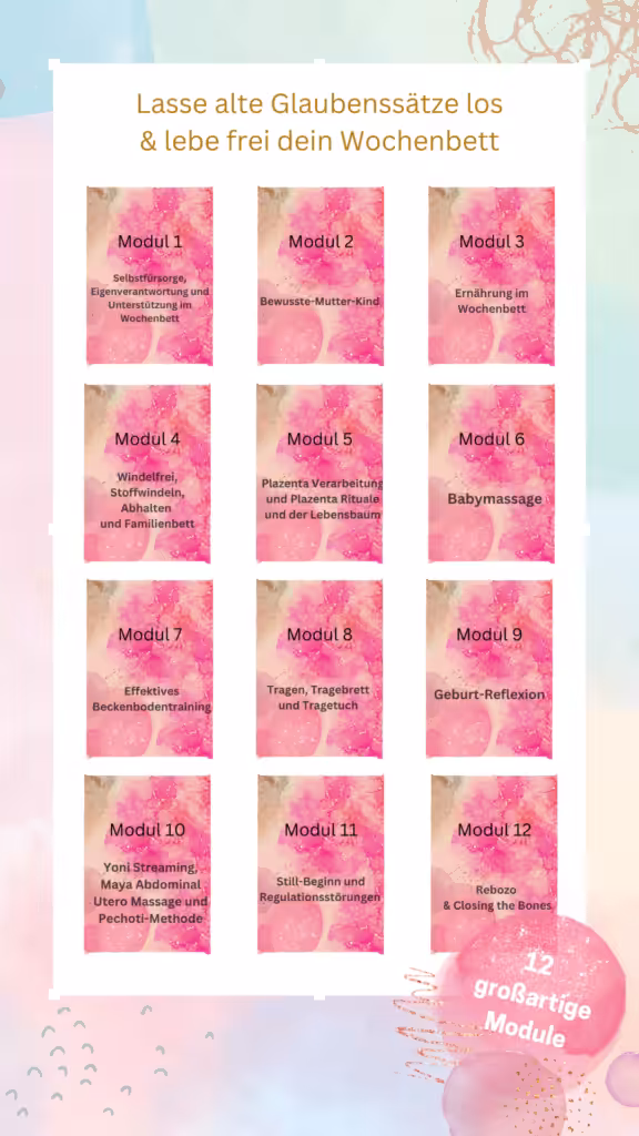 Jedes Modul ist dabei einem anderen Schwerpunkt gewidmet. So kannst du dich individuell auf dein Wochenbett und die Zeit danach vorbereiten.